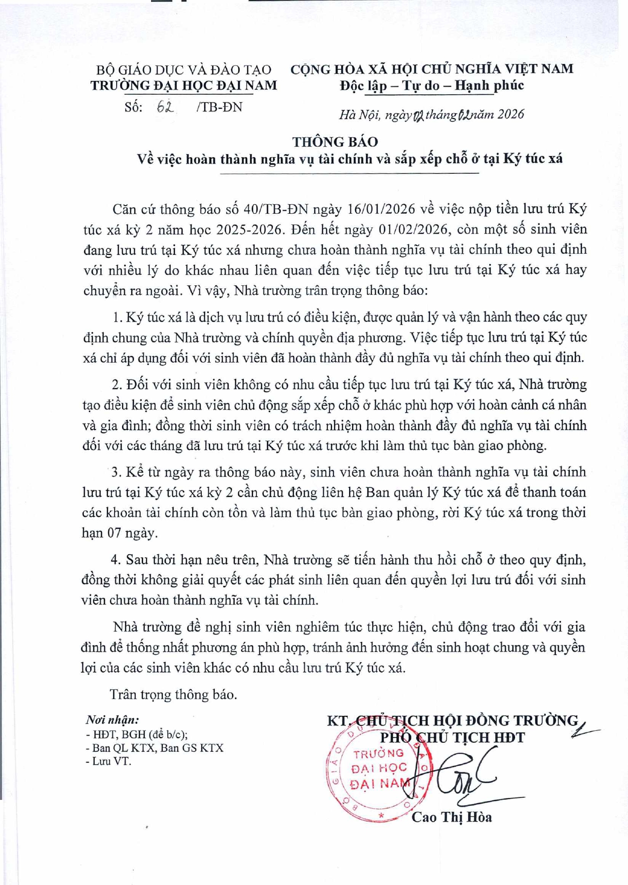 Thông báo V/v: Hoàn thành nghĩa vụ Tài chính và sắp xếp chỗ ở tại Ký túc xá